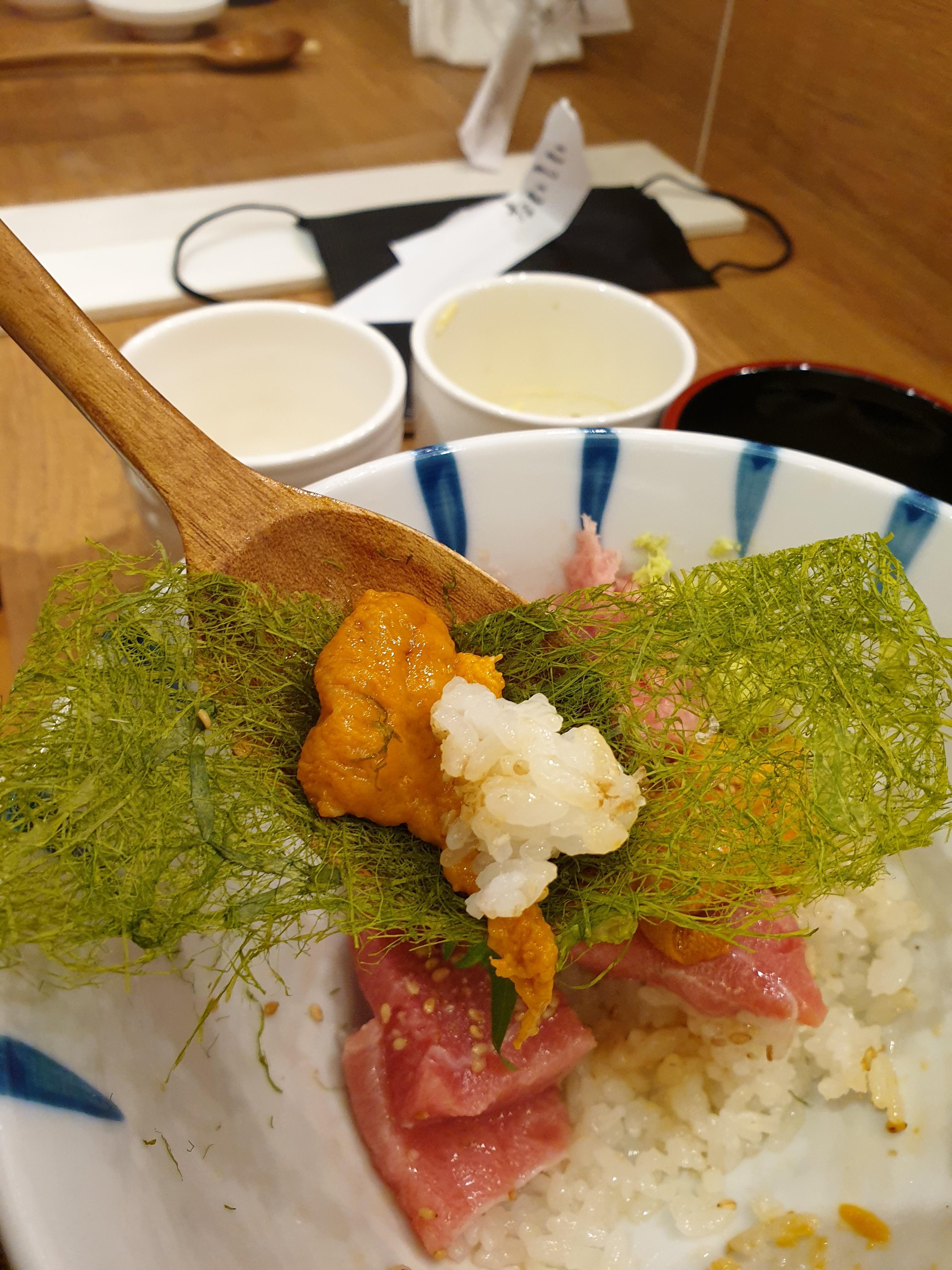 감태(김과 비슷)와 함께 참치회 혹은 우니를 밥과 함께 싸서 먹으면 꿀맛 조합입니다 !