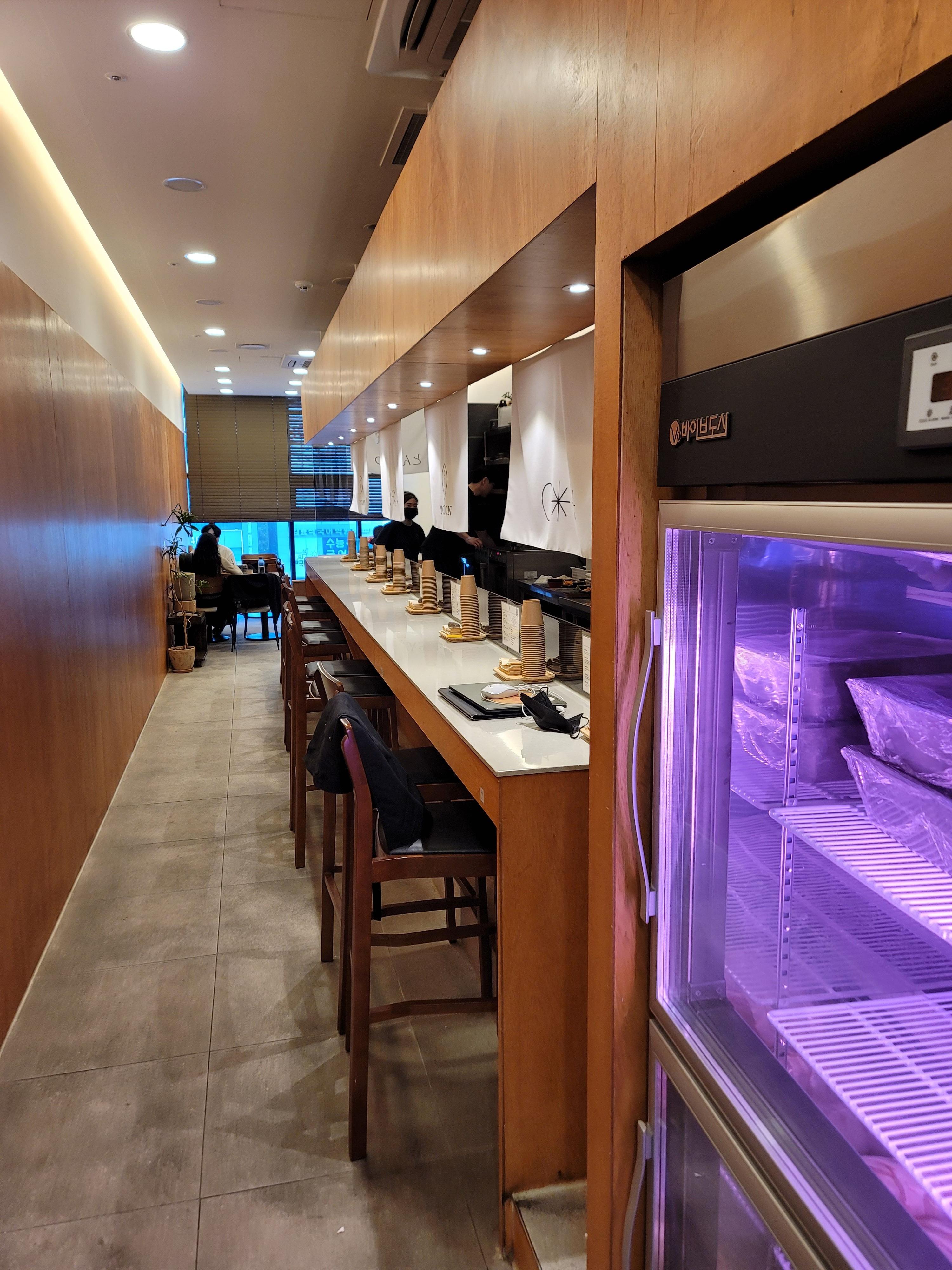 식당 내부는 일자형 테이블과 4인석 테이블로 구성되어 있었어요.