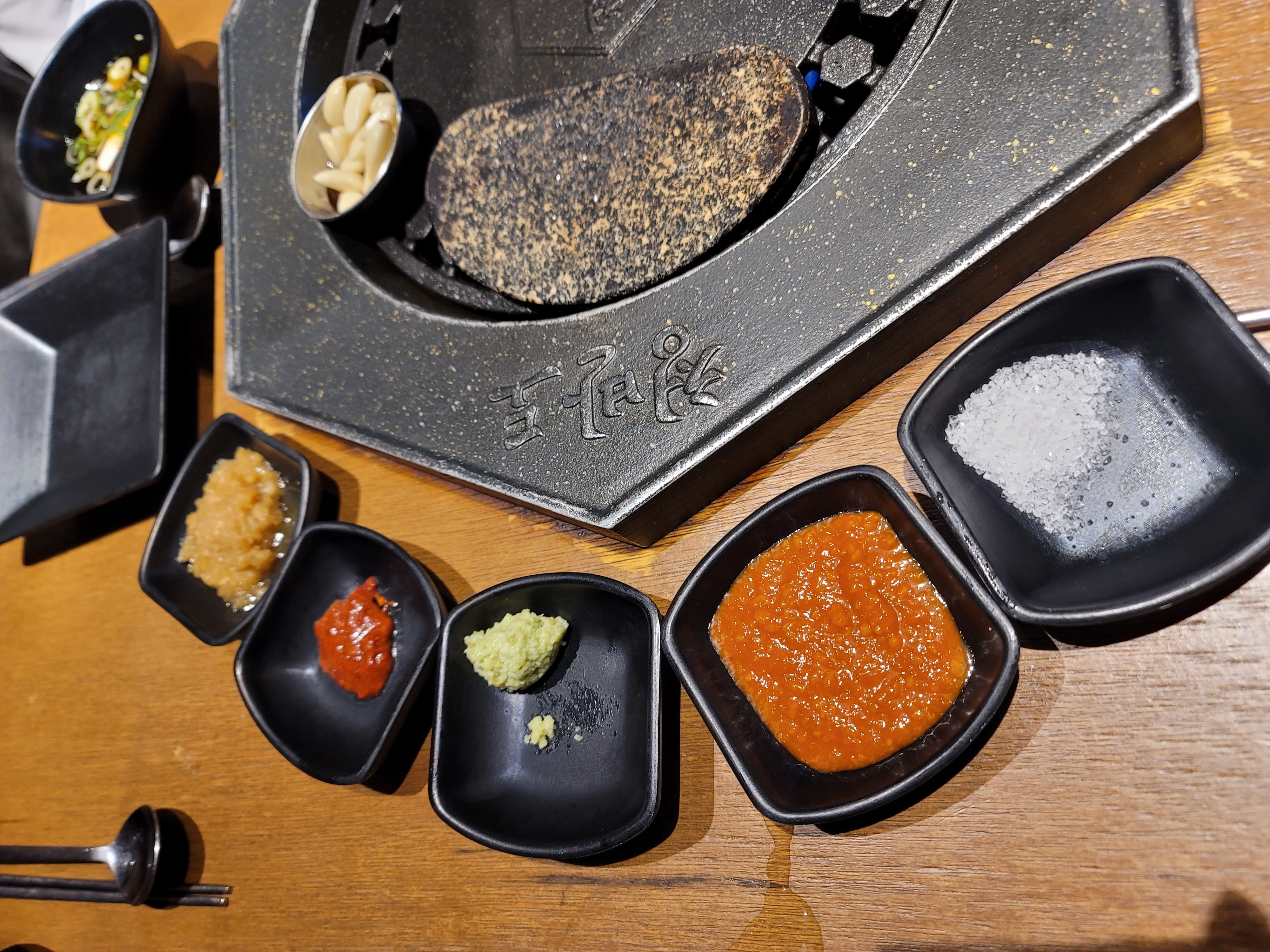 마늘소스, 젓갈, 와사비, 쌈장, 소금, 간장소스가 있고,