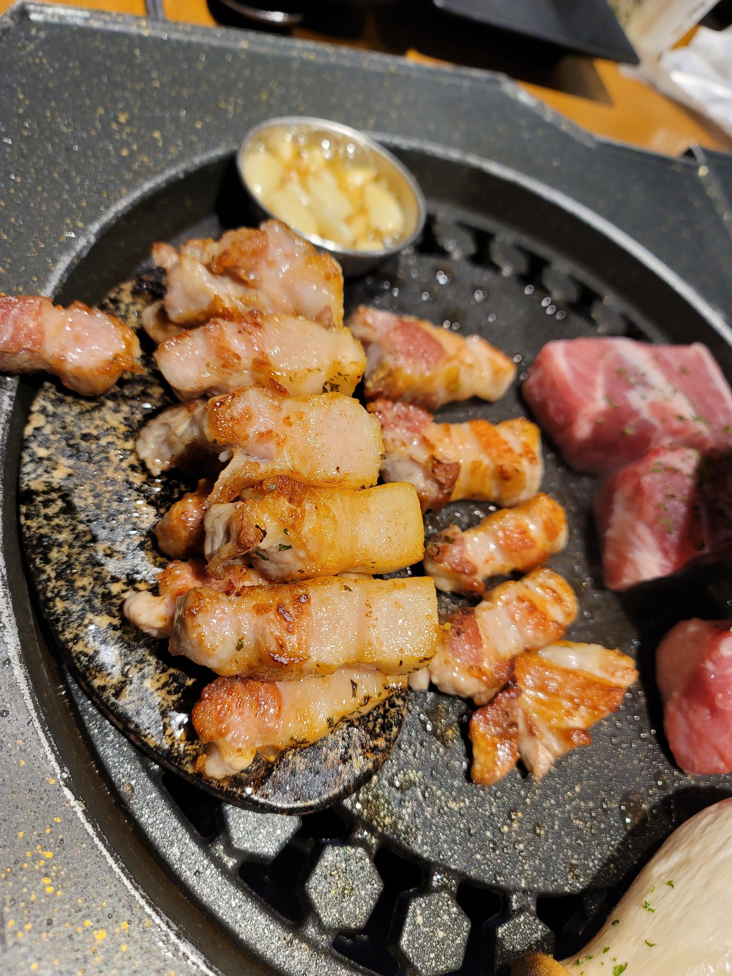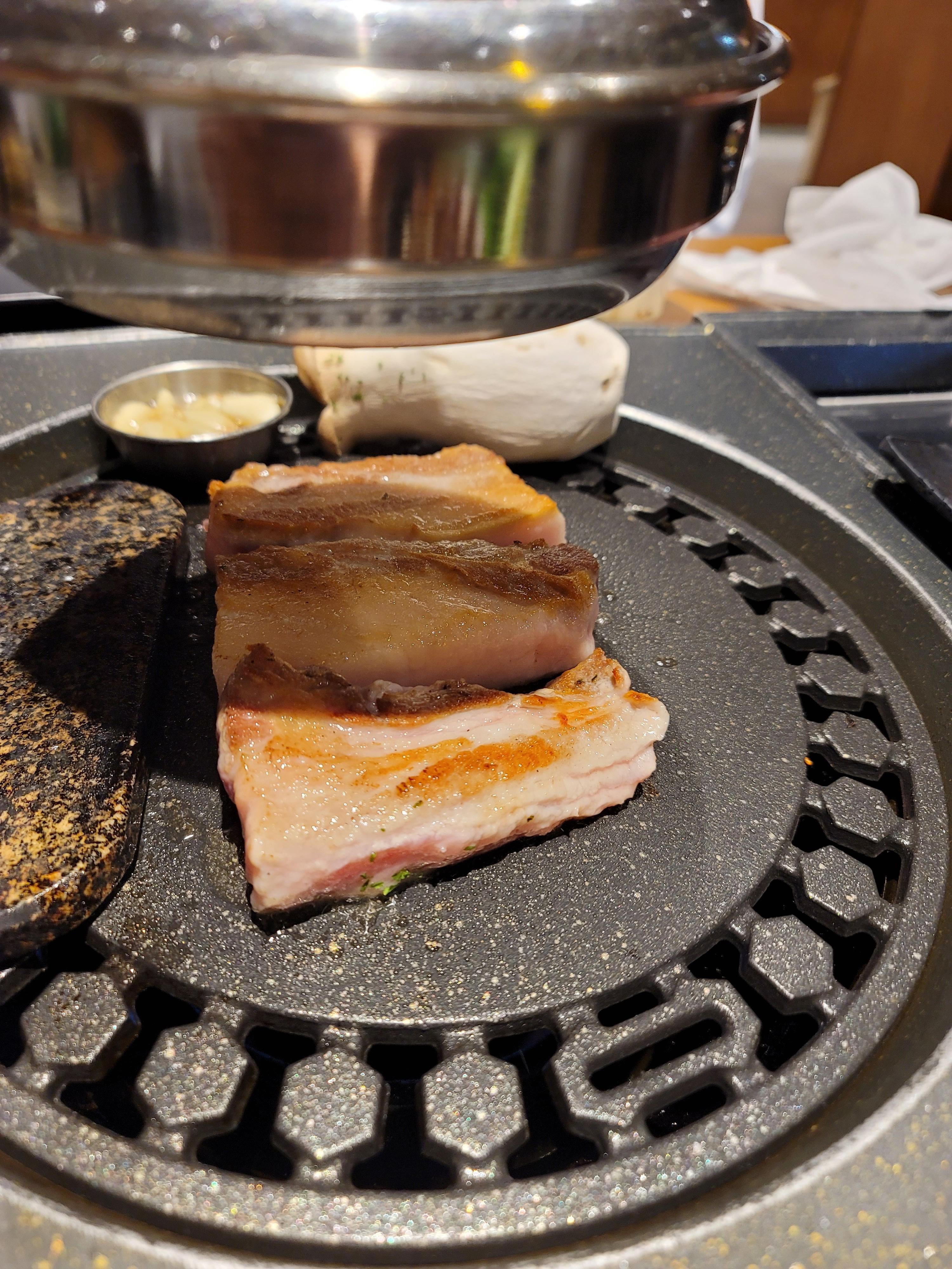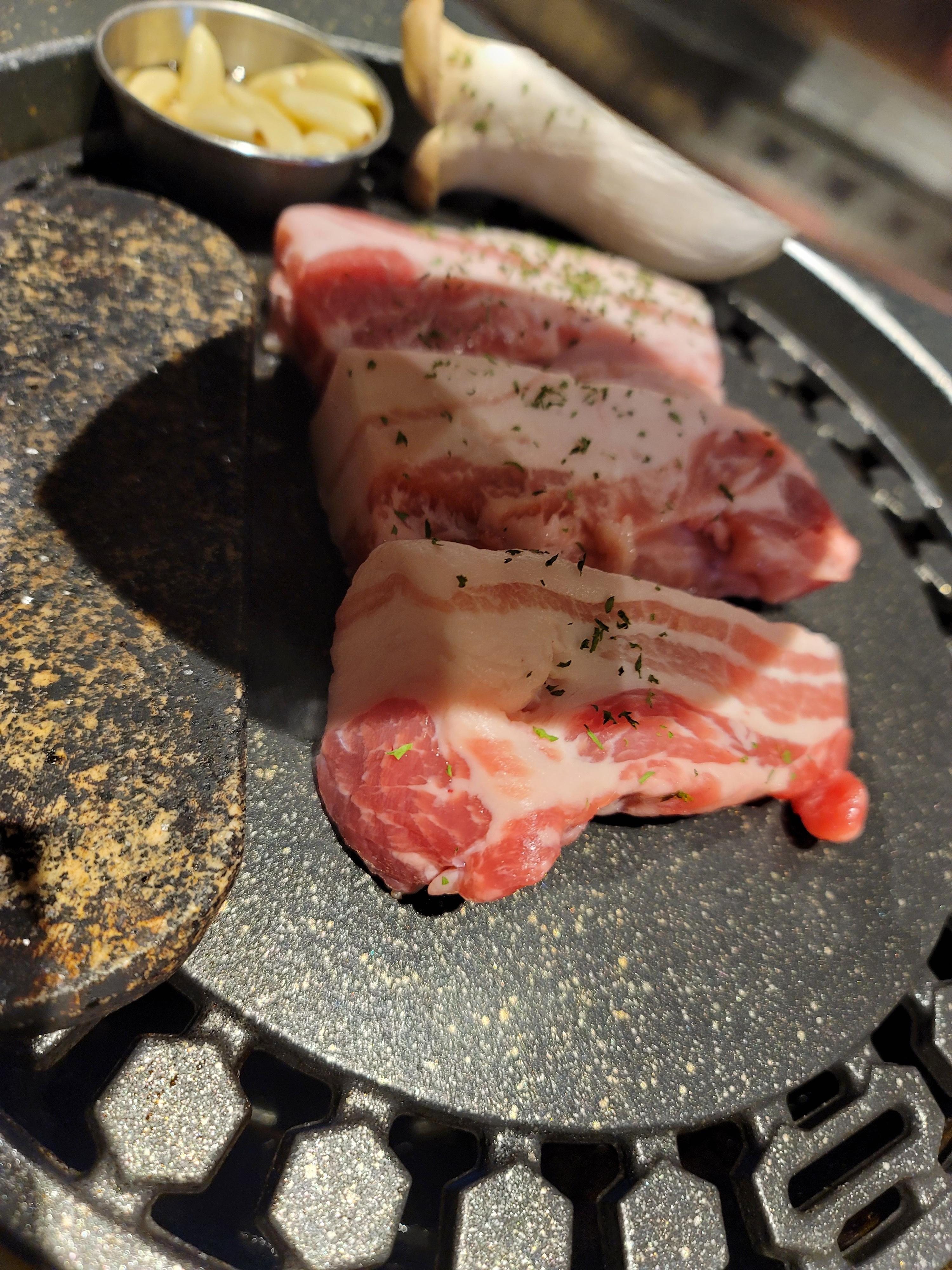 두툼한 삼겹살이 그릴 위에서 지글지글 구워지는 모습은 보는 것만으로도 군침이 돌게 하네요.