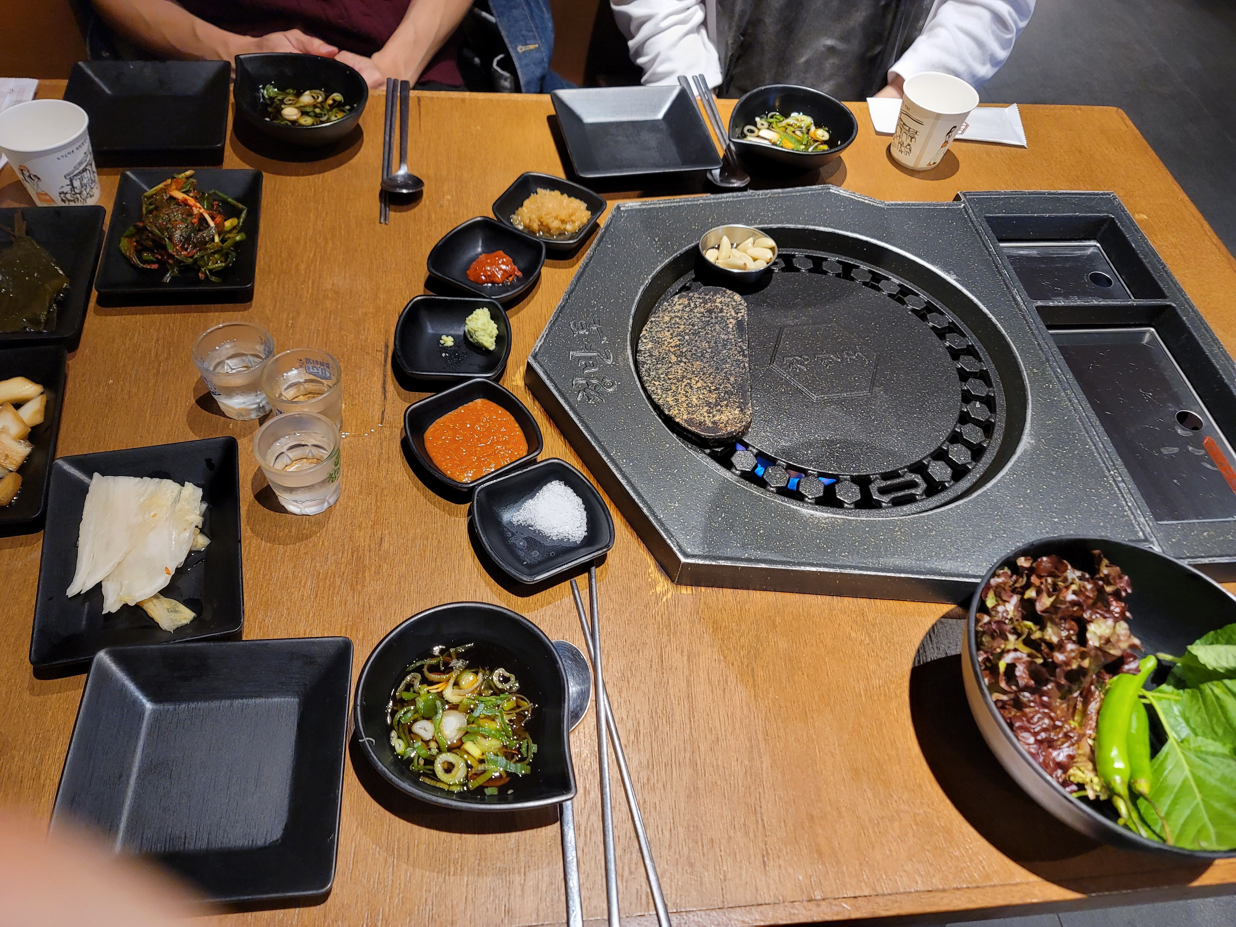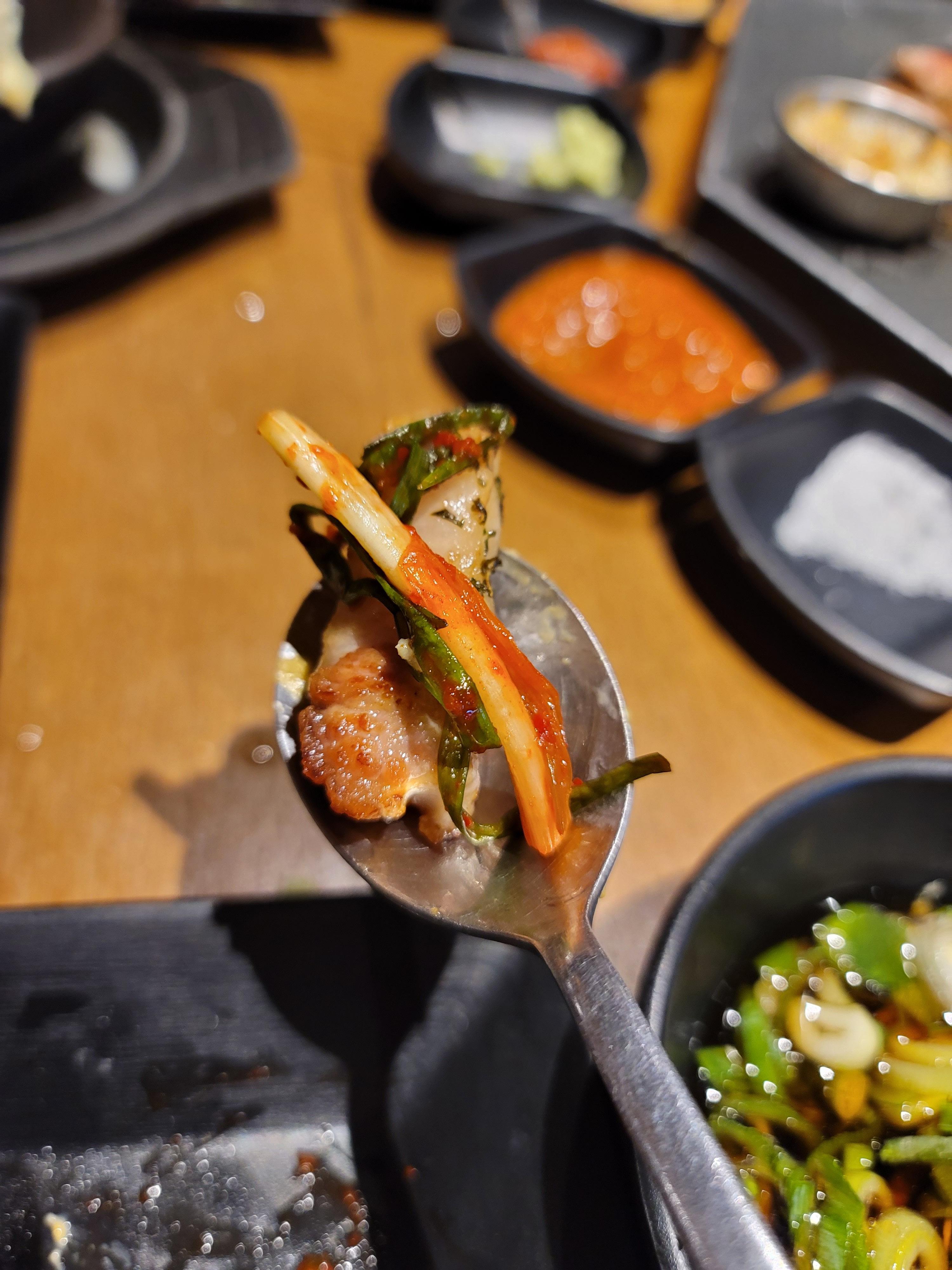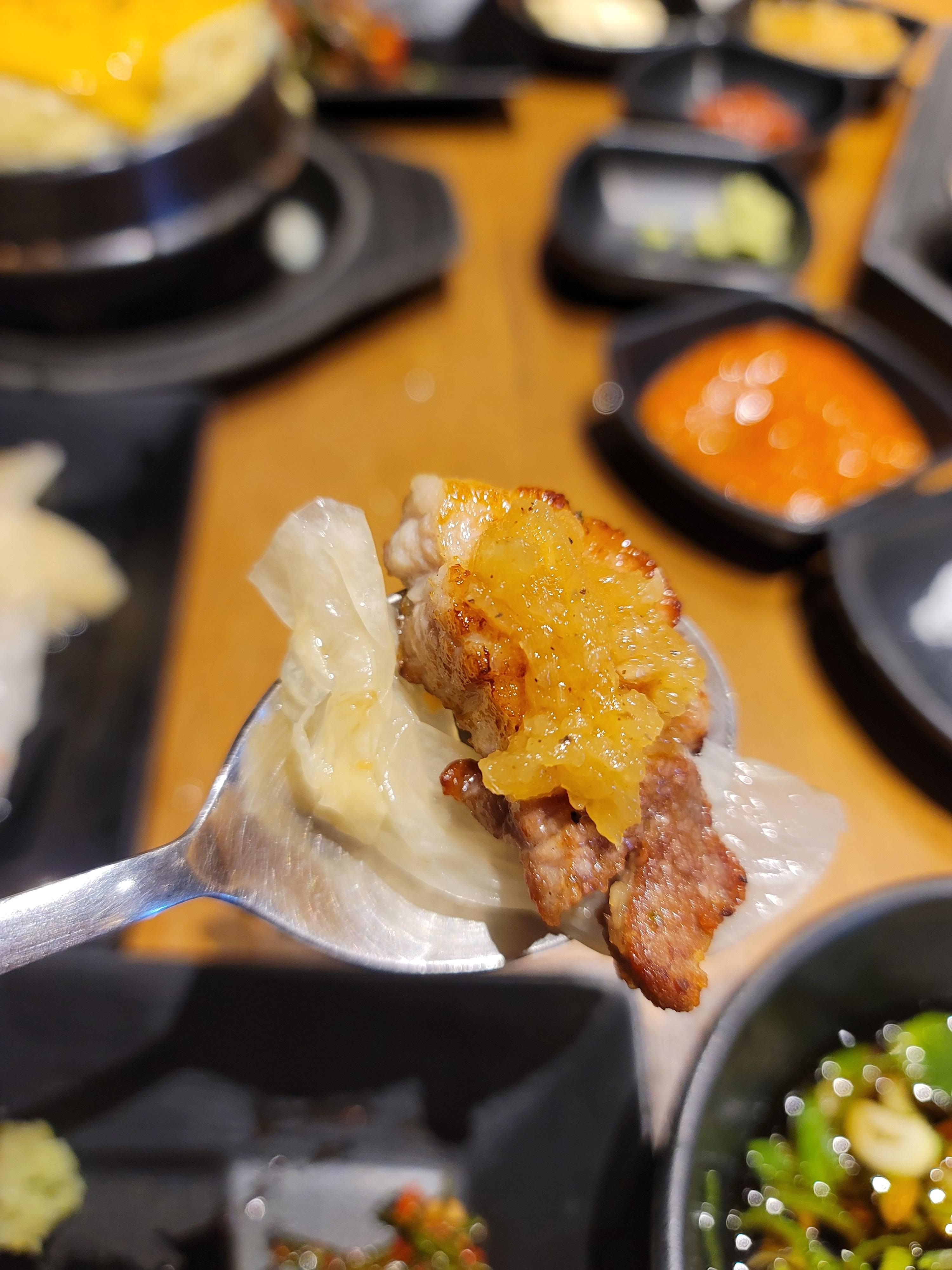고기가 잘 구워지면, 그 위에 각종 소스와 반찬들과 조합하여 먹으면 아주 꿀맛입니다요.