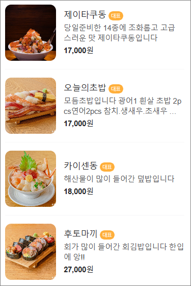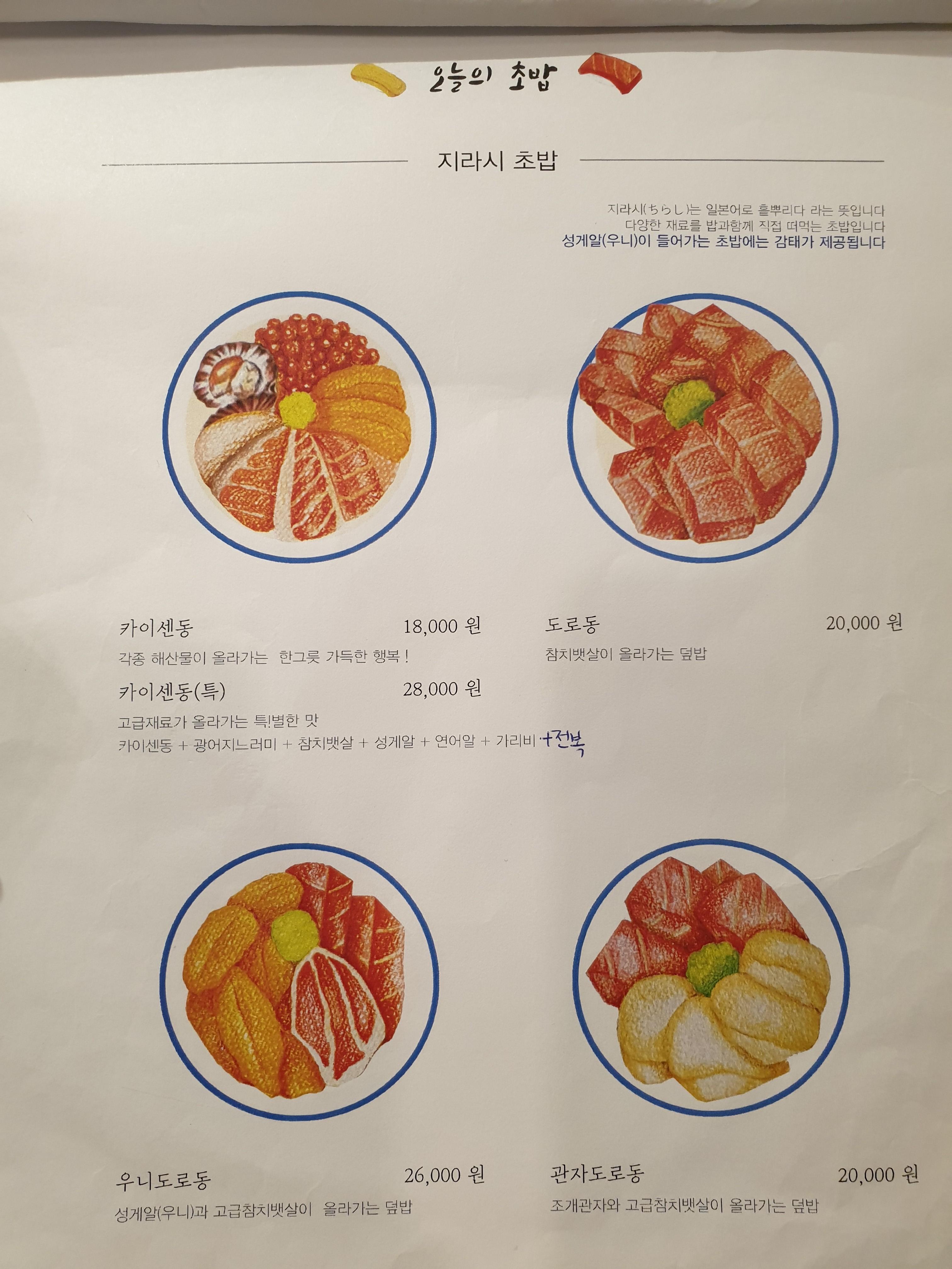 메뉴는 제이타쿠동, 카이센동, 후토마끼, 오늘의 초밥이 대표 메뉴구요!