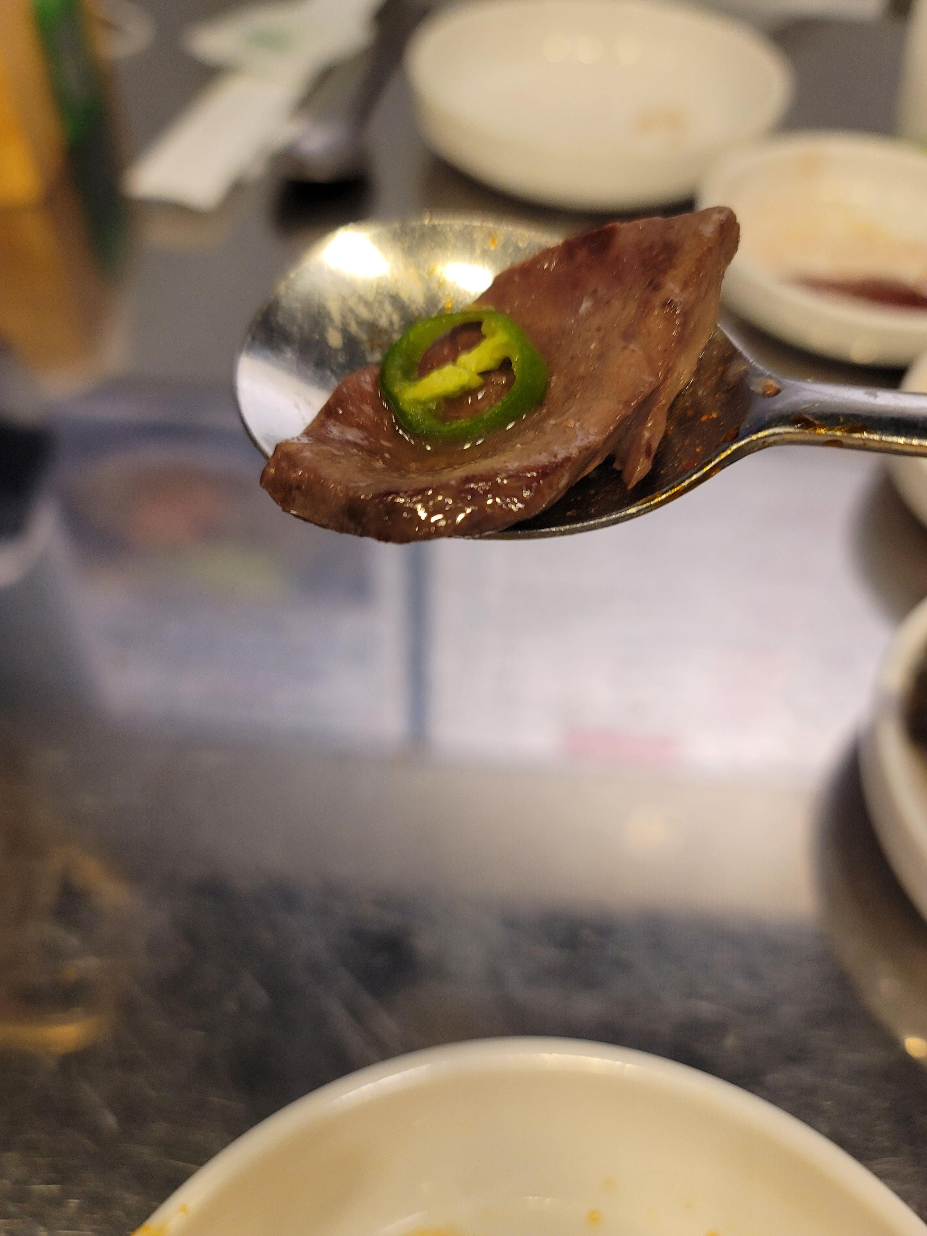 질겨지기 전에 잘 익은 염통 한 점을 먼저 주십니다.