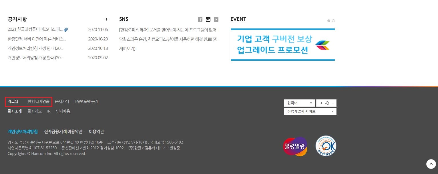 2. 스크롤을 제일 하단까지 내려 자료실 - 한컴타자연습을 클릭합니다.