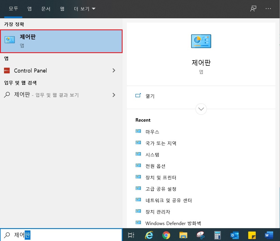 1. 윈도우 검색창에 "제어판"을 입력하여 제어판 폴더를 클릭합니다.