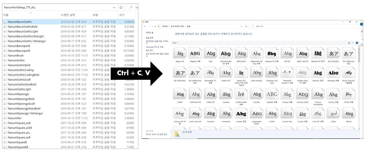 3. 다운받은 글꼴 파일을 "글꼴" 폴더로 복사+붙여넣기 합니다.