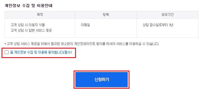 4. 개인정보 수집 및 이용에 체크를 하고 신청하기를 클릭합니다.