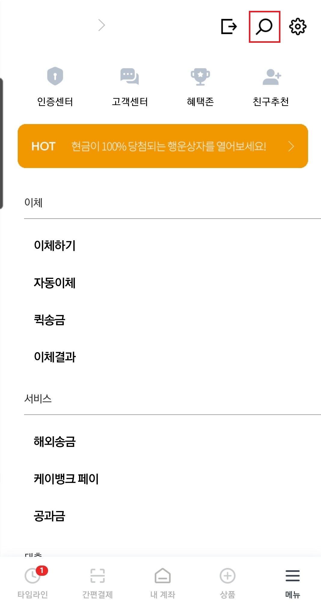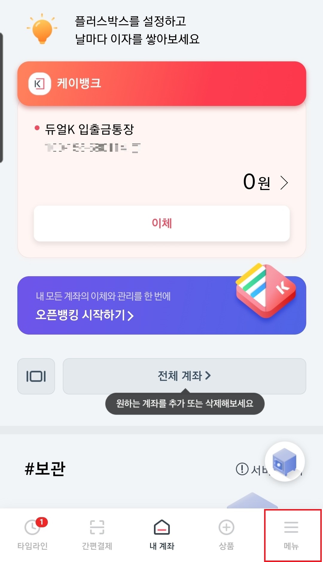 1. 케이뱅크 어플 실행 → 우측 하단 【메뉴】 터치!