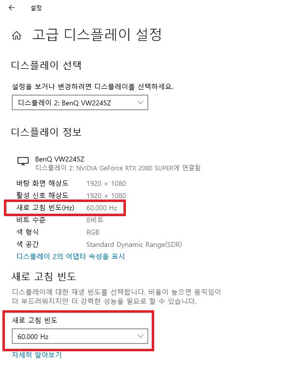 4. 【새로 고침 빈도(Hz)】가 모니터 현재 주사율 확인